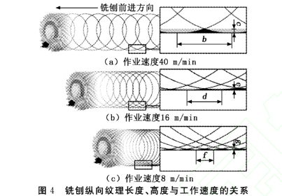 銑刨面縱向紋理的間距深度則與工作速度、刀尖線速度有關(guān)。圖4為銑刨縱向紋理長(zhǎng)度、高度與工作速度的關(guān)系,可見銑刨作業(yè)速度越快,銑刨的紋理長(zhǎng)度越長(zhǎng)(如圖4所示,紋理長(zhǎng)度b>d>f)、紋理高度越高(如圖4所示,紋理高度c>e>g),則表面越粗糙;反之,作業(yè)速度越慢,紋理越細(xì)密。而刀尖線速度則與銑刨轉(zhuǎn)子直徑和轉(zhuǎn)速有關(guān),銑刨轉(zhuǎn)子直徑越大,轉(zhuǎn)速越高,銑刨紋理就越密,這兩個(gè)參數(shù)與銑刨機(jī)廠家設(shè)計(jì)有關(guān)。